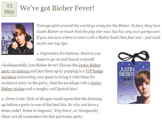 “It’s no surprise that women love Justin Bieber,” writes the blog, adding, “but his newest admirer is one of the most eligible bachelorettes in the world: Pippa Middleton!” Hardcore fans can shell out £20.89 on the Justin Bieber Ultimate Party Kit, containing party plates, cups, napkins and balloons as well as a birthday banner. The Party Times article said: “Teenage girls around the world go crazy for Bieber. In fact, they love Justin Bieber so much that the op star now has his very own party-ware.” visit also Pippa Middleton Bikini Pics;